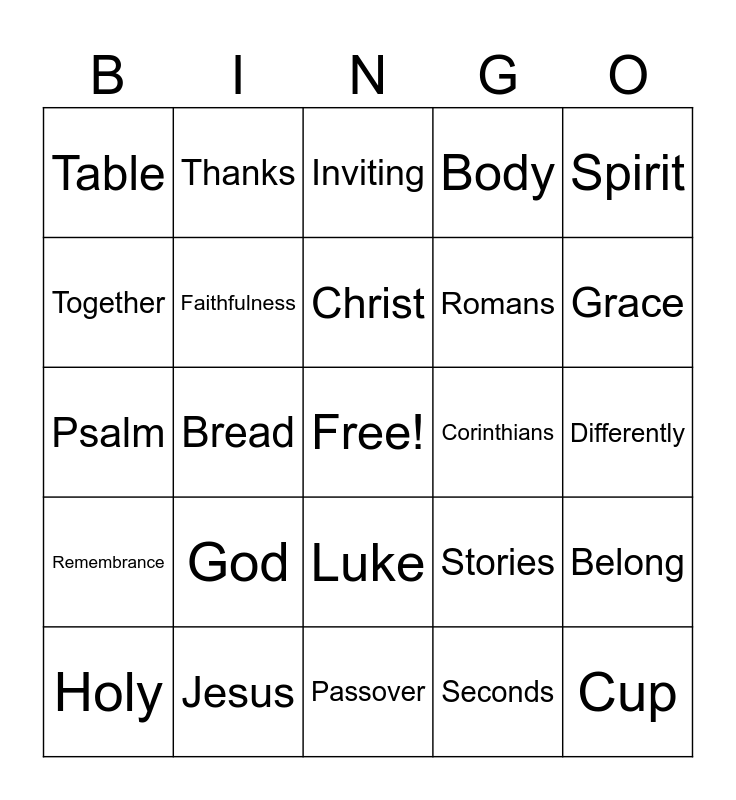 This bingo card has a free space and 24 words: God, Jesus, Christ, Holy, Spirit, Table, Together, Thanks, Corinthians, Luke, Romans, Psalm, Stories, Belong, Faithfulness, Seconds, Differently, Inviting, Grace, Bread, Cup, Remembrance, Body and Passover.