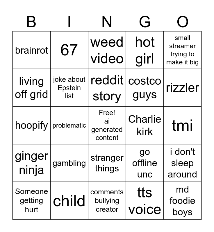 This bingo card has a free space and 24 words: Someone getting hurt, gambling, reddit story, tts voice, small streamer trying to make it big, brainrot, 67, weed video, Charlie kirk, tmi, hoopify, joke about Epstein list, go offline unc, i don't sleep around, living off grid, child, comments bullying creator, hot girl, rizzler, ginger ninja, problematic, stranger things, costco guys and md foodie boys.