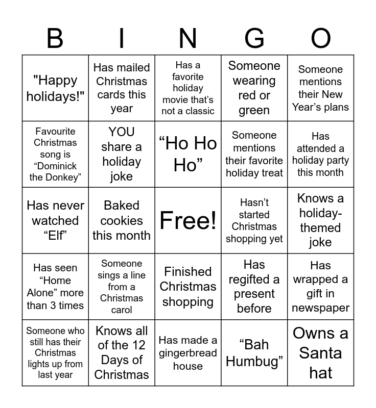 This bingo card has a free space and 35 words: Self-described Scrooge, Never tried eggnog, Has built a snowman this year, YOU share a holiday joke, Finished Christmas shopping, Someone wearing red or green, Favourite Christmas song is “Dominick the Donkey”, Someone quotes a holiday movie, “Ho Ho Ho”, Shared a favorite holiday memory, Has never watched “Elf”, Someone mentions their New Year’s plans, Put their Christmas tree up before November 15, Wearing a holiday sweater, "Happy holidays!", Hasn’t started Christmas shopping yet, “Bah Humbug”, Baked cookies this month, Has seen “Home Alone” more than 3 times, Owns a Santa hat, Has regifted a present before, Someone who still has their Christmas lights up from last year, Has wrapped a gift in newspaper, Knows all of the 12 Days of Christmas, Has a favorite holiday movie that’s not a classic, Has attended a holiday party this month, Thinks “Die Hard” is a Christmas movie, Collects a certain kind of Christmas decoration/ornament, Someone mentions their favorite holiday treat, Knows a holiday-themed joke, Has a Christmas mug they only use this time of year, Has made a gingerbread house, Someone sings a line from a Christmas carol, Has mailed Christmas cards this year and Makes mulled wine.