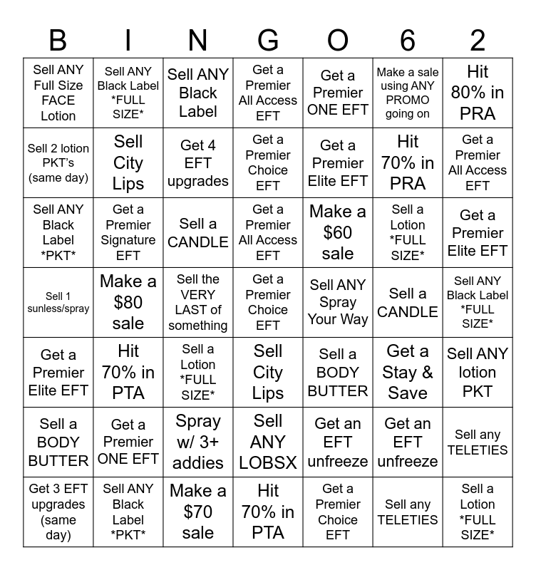 ⚠ This card has duplicate items: Sell City Lips (4), Sell a CANDLE (4), Sell any TELETIES (4), Sell the VERY LAST of something (4), Sell ANY *PKT* (2), Sell ANY *PKT/FULL SIZE* (2), Sell ANY Black Label *FULL SIZE* (6), Sell ANY Black Label *PKT* (2), Sell ANY Spray Your Way (3), Sell ANY Black Label (2), Sell ANY Full Size Lotion (3), *UPG*- ANY EFT (2), Get a Premier All Access EFT (12), Get a Premier Elite EFT (12), Get a Premier Signature EFT (12), Get a Premier Choice EFT (12), Get a Premier ONE EFT (11), Sell 1 sunless/spray (4), Make a sale using ANY PROMO going on (12), Sell ANY Full Size FACE Lotion (3), Sell a BODY BUTTER (2), Sell ANY Tan Extender (4), Sell a Lotion *FULL SIZE* (7), Sell a Lotion *PKT* (6), Sell a Lotion *Π ΠΠ’* (2), Sell ANY lotion PKT (2), Hit 70% in PTA (2), Hit 70% in PRA (2), Hit 75% in PTA (2), Hit 75% in PRA (2), Hit 80% in PTA (2), Hit 80% in PRA (2), Hit 90% in PTA (2), Hit 90% in PRA (2), Hit 100% in PTA (2), Hit 100 % in PRA (2), Make a $10 sale (2), Make a $15 sale (2), Make a $20 sale (2), Make a $40 sale (2), Make a $50 sale (2), Make a $60 sale (2), Make a $70 sale (2), Make a $80 sale (2), Make a $90 sale (2), Make a $100+ sale (2), Make a $150 sale (2), Make a sale (2), Get any WELLNESS EFT (2), *UPG* ANY EFT (4), Sell any 2 pack sessions (2), Pick a PKT, Pick a BED (on WEDNESDAY) (4), Sell ANY 3 pack Tans/Wellness (2), Sell ANY 10 pack Tans/Wellness (2), Spray w/ 2+ addies (2), Spray w/ 3+ addies (2), Sell 1 (or more) addies (2), Sell 3+ addies (2), Sell 5+ addies (3), Sell ANY Lotion *FULL SIZE* (2), Sell 2 lotion PKTβs (same day) (2), Get an EFT unfreeze (6), Get a Stay & Save (6), Sell ANY Premier *PKT* (2), Sell ANY Premier *PKT/FULL SIZE* (2), Sell ANY LOBSX (2)