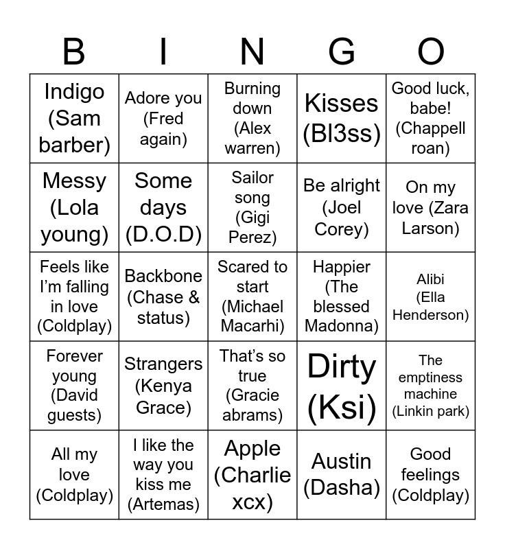 This bingo card has 35 words: APT (Bruno mars), The door (Teddy swims), Taste (Sabrina carpenter), Some days (D.O.D), That’s so true (Gracie abrams), Kisses (Bl3ss), Messy (Lola young), Guess (Charli xcx, billie elisih), Sailor song (Gigi Perez), Die with a smile (Lady gaga), Feels like I’m falling in love (Coldplay), Good luck, babe! (Chappell roan), Bad dreams (Teddy swims), Beautiful things (Benson Boone), Indigo (Sam barber), Happier (The blessed Madonna), Austin (Dasha), Backbone (Chase & status), Forever young (David guests), Scared to start (Michael Macarhi), Dirty (Ksi), All my love (Coldplay), The emptiness machine (Linkin park), I like the way you kiss me (Artemas), Burning down (Alex warren), On my love (Zara Larson), Good feelings (Coldplay), Slow it down (Benson Boone), Be alright (Joel Corey), Alibi (Ella Henderson), Illusion (Dua lipa), Apple (Charlie xcx), Strangers (Kenya Grace), Adore you (Fred again) and Bittersweet goodbye (Issue cross).