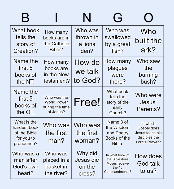 This bingo card has a free space and 24 words: Who was the first man?, Who was placed in a basket in the river?, How do we talk to God?, Who was a man after God's own heart?, Who built the ark?, What book tells the story of Creation?, Name the first 5 books of the NT., How many books are in the Catholic Bible?, What book tells the story of the early Church?, Who was the first woman?, How many plagues were there?, Name the first 5 books of the OT., Name 3 of the Wisdom and Poetry Books of the Bible., In which Gospel does Jesus teach his disciples the Lord's Prayer?, How many books are in the New Testament?, In what book of the Bible does Moses receive the 10 Commandments?, Who were Jesus' Parents?, Who was thrown in a lions den?, Who saw the burning bush?, Who was the World Power during the time of Jesus?, How does God talk to us?, What is the hardest book of the Bible for you to pronounce?, Who was swallowed by a great fish? and Why did Jesus die on the cross?.