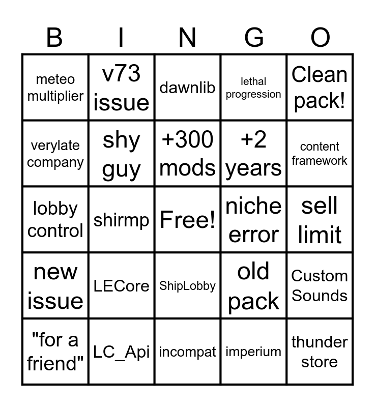 This bingo card has a free space and 24 words: LECore, LC_Api, +300 mods, "for a friend", Clean pack!, meteo multiplier, verylate company, v73 issue, niche error, ShipLobby, +2 years, lobby control, old pack, Custom Sounds, shy guy, imperium, sell limit, dawnlib, content framework, shirmp, thunder store, new issue, lethal progression and incompat.