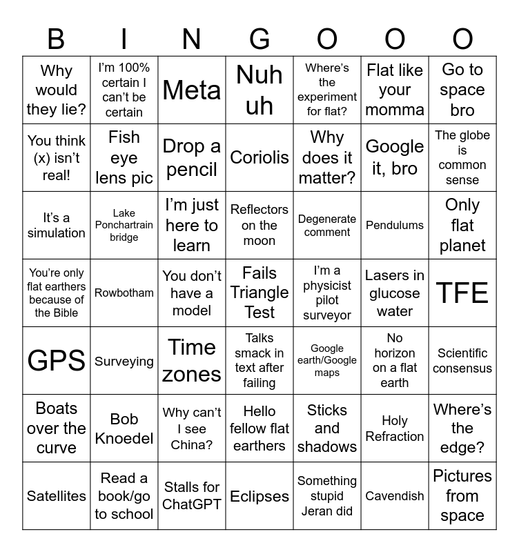 This bingo card has a free space and 48 words: Sticks and shadows, Google it, bro, Eclipses, Rowbotham, I’m just here to learn, TFE, I’m 100% certain I can’t be certain, Read a book/go to school, Flat like your momma, Talks smack in text after failing, Go to space bro, Nuh uh, Pendulums, Degenerate comment, Boats over the curve, Lasers in glucose water, You think (x) isn’t real!, The globe is common sense, Holy Refraction, Where’s the experiment for flat?, Why does it matter?, You don’t have a model, Why would they lie?, Fish eye lens pic, Where’s the edge?, Drop a pencil, Only flat planet, Satellites, Reflectors on the moon, Lake Ponchartrain bridge, Cavendish, I’m a physicist pilot surveyor, Scientific consensus, Bob Knoedel, You’re only flat earthers because of the Bible, Google earth/Google maps, No horizon on a flat earth, It’s a simulation, Time zones, Why can’t I see China?, GPS, Pictures from space, Meta, Stalls for ChatGPT, Coriolis, Hello fellow flat earthers, Surveying and Something stupid Jeran did.