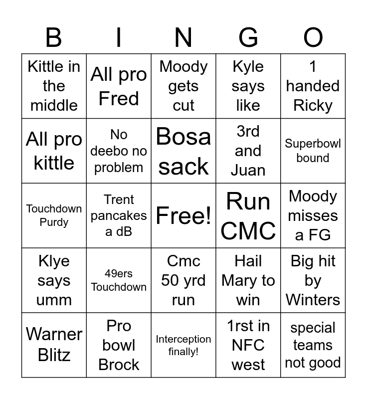 This bingo card has a free space and 24 words: 49ers Touchdown, Pro bowl Brock, Bosa sack, Warner Blitz, 1 handed Ricky, Kittle in the middle, All pro kittle, All pro Fred, Run CMC, Cmc 50 yrd run, 3rd and Juan, Touchdown Purdy, Hail Mary to win, Big hit by Winters, No deebo no problem, 1rst in NFC west, Moody misses a FG, Moody gets cut, Superbowl bound, Trent pancakes a dB, special teams not good, Klye says umm, Kyle says like and Interception finally!.