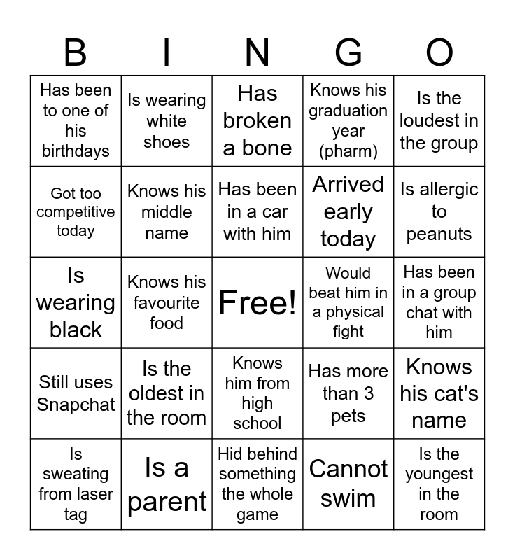 This bingo card has a free space and 39 words: Has seen him drunk, Arrived late today, Has a photo of him on their phone, Knows his middle name, Is sweating from laser tag, Knows him from high school, Has been in a car with him, Has been to 5+ countries, Is the loudest in the group, Still uses Snapchat, Knows his favourite food, Knows his graduation year (pharm), Is the youngest in the room, Has been in a group chat with him, Would beat him in a physical fight, Is the oldest in the room, Has lived with him, Has been to one of his birthdays, Is wearing green, Has more than 3 pets, Got too competitive today, Hid behind something the whole game, Arrived early today, Is allergic to peanuts, Is funnier than him, Can do a pistol squat, Has a tattoo, Can bench more than him, Just met him today, Is wearing white shoes, Works in healthcare, Works in the trades, Has broken a bone, Is a parent, Cannot swim, Has been to Japan, Knows his cat's name, Is wearing black and Has been in a car with him.