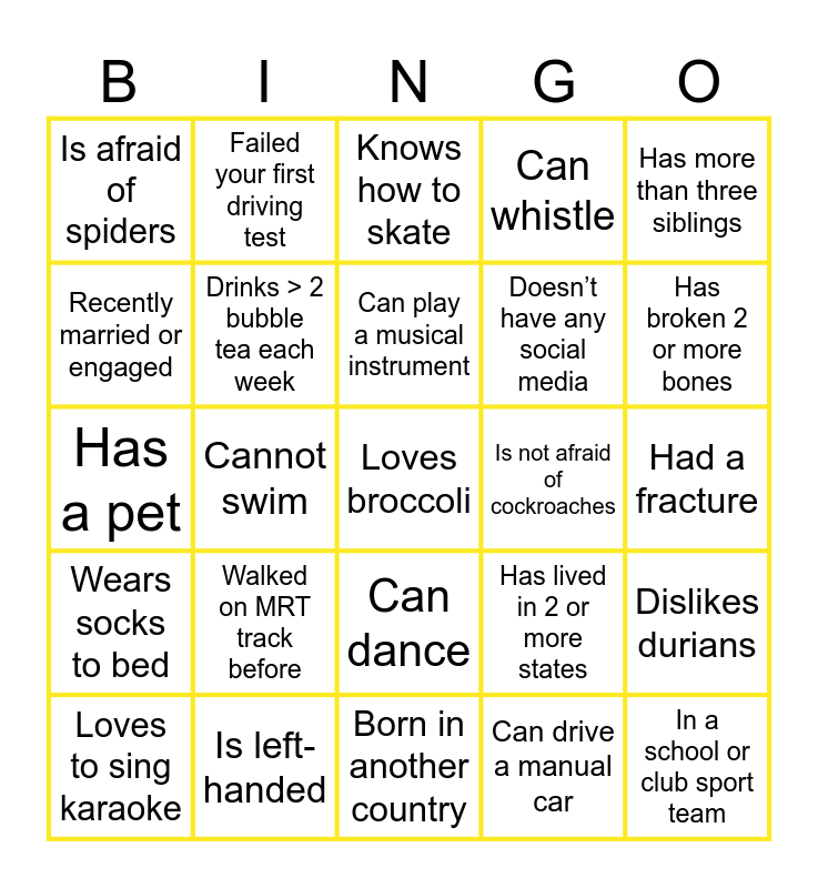 This bingo card has 41 words: Has a part-time job, Has a pet, Has / had braces, Drinks > 2 bubble tea each week, Is left-handed, Can dance, Can play a musical instrument, Sleeps before 11pm on weekdays, Has more than three siblings, Wears socks to bed, Cannot swim, Can whistle, Loves broccoli, Had a fracture, Is not afraid of cockroaches, Walked on MRT track before, Has ridden / pillion on a motorcycle, Is afraid of spiders, Is fluent in another language, Knows how to skate, Dislikes durians, In a school or club sport team, Born in another country, Doesn’t have any social media, Went camping recently, Has hosted a virtual Happy Hour, Can drive a manual car, Can knit or quilt, Has broken 2 or more bones, Has never been on a plane, Never swears, Failed your first driving test, Loves to sing karaoke, Graduated high school early, Has lived in 2 or more states, Recently married or engaged, Doesn’t have any social media, Has read a good book recently, Loves true crime shows or podcasts, Has picked out a Halloween costume and Is an only child.