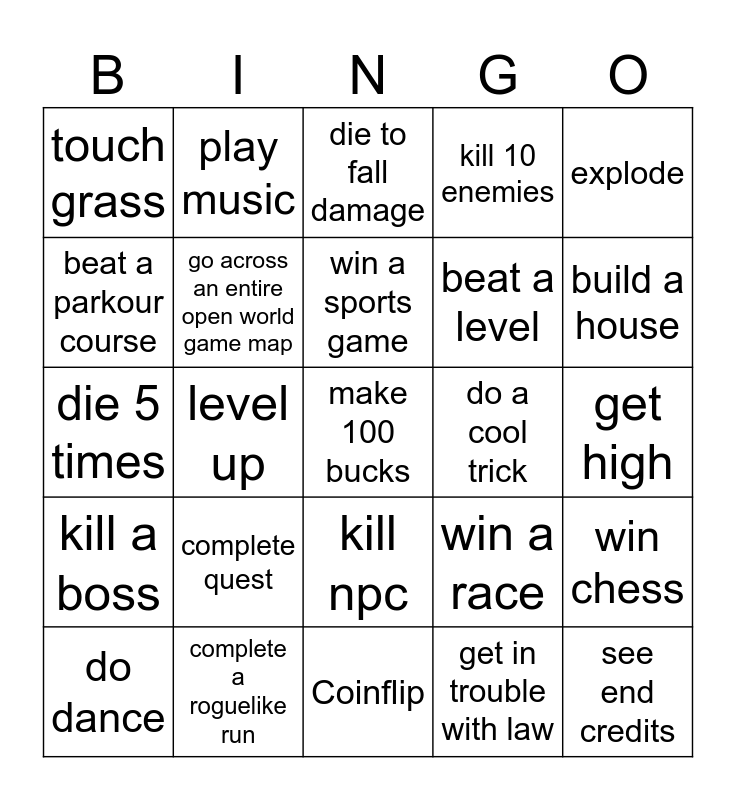 This bingo card has 25 words: kill a boss, complete a roguelike run, make 100 bucks, get in trouble with law, explode, touch grass, play music, die to fall damage, do a cool trick, win chess, beat a parkour course, go across an entire open world game map, Coinflip, win a race, build a house, do dance, level up, win a sports game, beat a level, get high, die 5 times, complete quest, kill npc, kill 10 enemies and see end credits.
