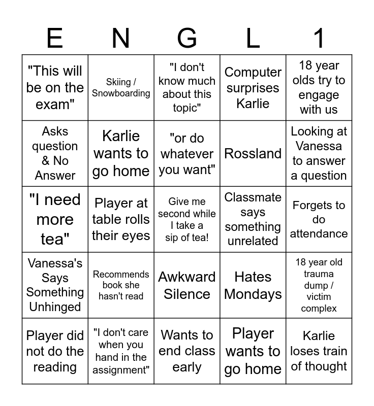 This bingo card has a free space and 27 words: Hates Mondays, Hates Mornings, Rossland, Wants to end class early, Asks question & No Answer, "I don't know much about this topic", Skiing / Snowboarding, Vanessa's Says Something Unhinged, Classmate says something unrelated, 18 year old trauma dump / victim complex, "I need more tea", Computer surprises Karlie, Player did not do the reading, "I don't care when you hand in the assignment", Looking at Vanessa to answer a question, Karlie forgets players name, Karlie wants to go home, "or do whatever you want", Recommends book she hasn't read, "This will be on the exam", Forgets to do attendance, Player wants to go home, Player at table rolls their eyes, Karlie loses train of thought, Awkward Silence, 18 year olds try to engage with us and 18 year old says something unrelated.