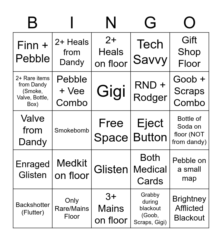 This bingo card has a free space and 25 words: Medkit on floor, 3+ Mains on floor, Gigi, Backshotter (Flutter), Gift Shop Floor, Finn + Pebble, 2+ Rare items from Dandy (Smoke, Valve, Bottle, Box), 2+ Heals from Dandy, Eject Button, Glisten, RND + Rodger, Valve from Dandy, Both Medical Cards, Pebble on a small map, Pebble + Vee Combo, Box of Chocolates on floor (NOT from dandy), Bottle of Soda on floor (NOT from dandy), 2+ Heals on floor, Goob + Scraps Combo, Smokebomb, Brightney Afflicted Blackout, Only Rare/Mains Floor, Enraged Glisten, Tech Savvy and Grabby during blackout (Goob, Scraps, Gigi).