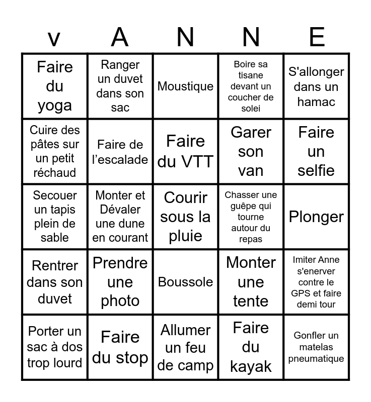 This bingo card has 27 words: Monter une tente, Gonfler un matelas pneumatique, Garer son van, Allumer un feu de camp, Cuire des pâtes sur un petit réchaud, Moustique, Ranger un duvet dans son sac, Rentrer dans son duvet, Chasser une guêpe qui tourne autour du repas, Imiter Anne s'enerver contre le GPS et faire demi tour, Secouer un tapis plein de sable, Boire sa tisane devant un coucher de solei, Porter un sac à dos trop lourd, Faire du stop, Faire un selfie, Faire du paddle paddle, Faire de l’escalade, Faire du VTT, Prendre une photo, Faire du yoga, Plonger, Faire du kayak, Monter et Dévaler une dune en courant, Courir sous la pluie, Boussole, S'allonger dans un hamac and Faire des ricochets.