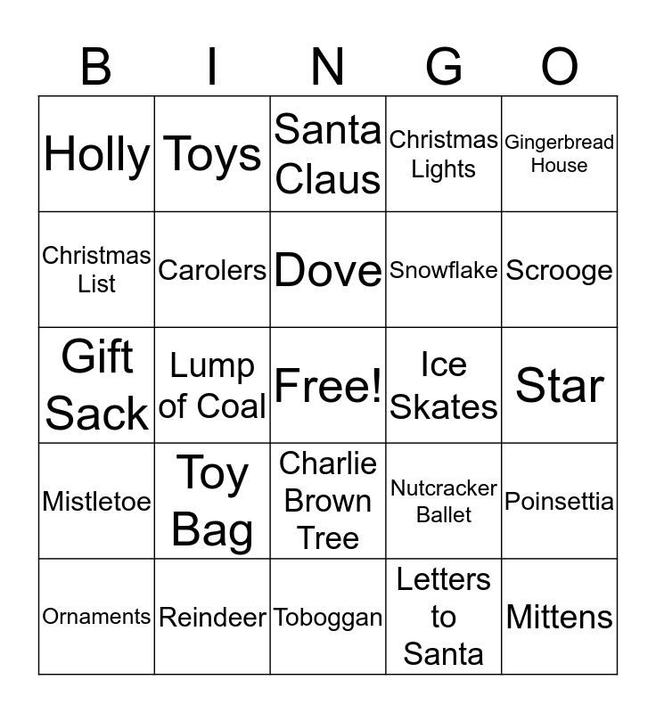 This bingo card has a free space and 35 words: Angel, Candy Cane, Cardinal, Carolers, Charlie Brown Tree, Christmas Lights, Christmas List, Christmas Tree, Dove, Frosty the Snowman, Gift Sack, Gingerbread House, Grinch, Free Space - Happy Holidays, Holly, Ice Skates, Letters to Santa, Lump of Coal, Mistletoe, Mittens, Nutcracker Ballet, Ornaments, Poinsettia, Reindeer, Santa Claus, Scrooge, Seasons' Greetings, Snowman, Snowflake, Star, Stocking, Toboggan, Toy Bag, Toys and Wreath.