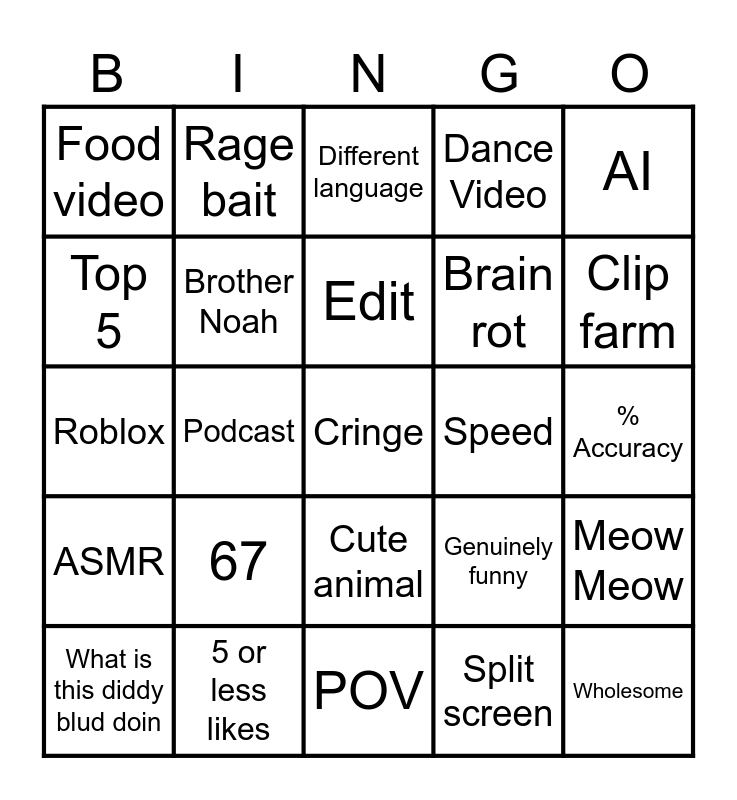 This bingo card has a free space and 24 words: 67, 5 or less likes, Edit, What is this diddy blud doin, AI, Food video, Top 5, Rage bait, Speed, Cute animal, Brain rot, Roblox, Genuinely funny, Meow Meow, Brother Noah, Split screen, % Accuracy, Different language, Clip farm, Podcast, Wholesome, ASMR, Dance Video and POV.