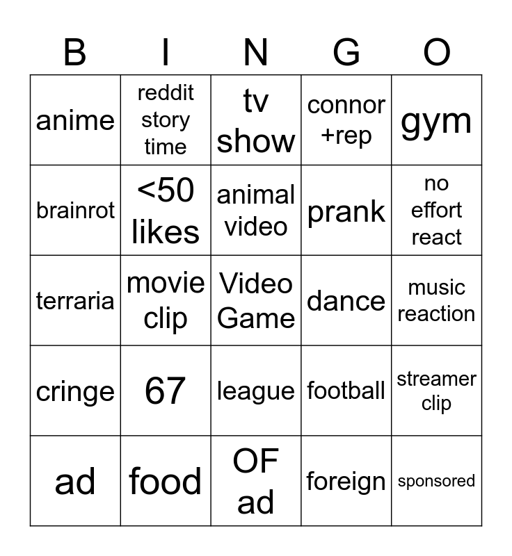 This bingo card has a free space and 24 words: 67, food, animal video, ad, gym, anime, brainrot, reddit story time, dance, league, prank, terraria, football, streamer clip, <50 likes, foreign, music reaction, tv show, no effort react, movie clip, sponsored, cringe, connor +rep and OF ad.