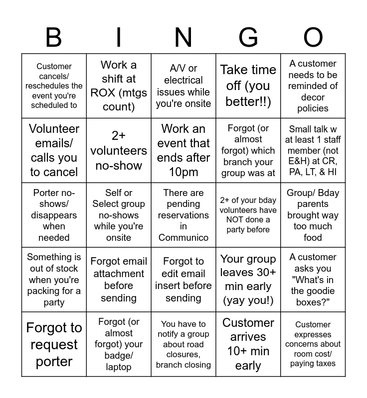 This bingo card has a free space and 32 words: Customer arrives 10+ min early, Birthday kiddo cries at their party 😢, Self or Select group no-shows while you're onsite, 2+ of your bday volunteers have done a party before, Something is out of stock when you're packing for a party, 2+ volunteers no-show, A customer needs to be reminded of decor policies, A customer asks you "What's in the goodie boxes?", Work a shift at ROX (mtgs count), Work an event that starts before 7am, Work an event that ends after 10pm, A/V or electrical issues while you're onsite, You have trouble locking the main door, Forgot (or almost forgot) your equipment at a branch, 2+ of your bday volunteers have NOT done a party before, Forgot to request volunteer roster, Forgot to request porter, Porter no-shows/ disappears when needed, Forgot to edit email insert before sending, Forgot email attachment before sending, Your group leaves 30+ min early (yay you!), Bday parent brings extra decor, Group/ Bday parents brought way too much food, Forgot (or almost forgot) your badge/ laptop, Customer expresses concerns about room cost/ paying taxes, Take time off (you better!!), Forgot (or almost forgot) which branch your group was at, Volunteer emails/ calls you to cancel, Customer cancels/ reschedules the event you're scheduled to, You have to notify a group about road closures, branch closing, Work a Medicare group on a weekend and Small talk w at least 1 staff member (not E&H) at CR, PA, LT, & HI.