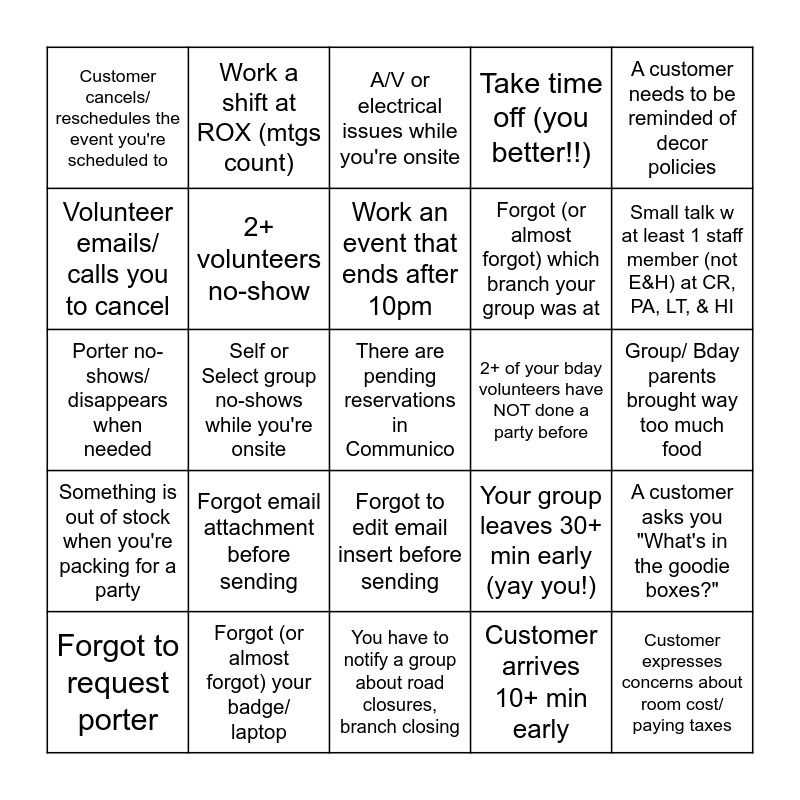 This bingo card has a free space and 32 words: Customer arrives 10+ min early, Birthday kiddo cries at their party 😢, Self or Select group no-shows while you're onsite, 2+ of your bday volunteers have done a party before, Something is out of stock when you're packing for a party, 2+ volunteers no-show, A customer needs to be reminded of decor policies, A customer asks you "What's in the goodie boxes?", Work a shift at ROX (mtgs count), Work an event that starts before 7am, Work an event that ends after 10pm, A/V or electrical issues while you're onsite, You have trouble locking the main door, Forgot (or almost forgot) your equipment at a branch, 2+ of your bday volunteers have NOT done a party before, Forgot to request volunteer roster, Forgot to request porter, Porter no-shows/ disappears when needed, Forgot to edit email insert before sending, Forgot email attachment before sending, Your group leaves 30+ min early (yay you!), Bday parent brings extra decor, Group/ Bday parents brought way too much food, Forgot (or almost forgot) your badge/ laptop, Customer expresses concerns about room cost/ paying taxes, Take time off (you better!!), Forgot (or almost forgot) which branch your group was at, Volunteer emails/ calls you to cancel, Customer cancels/ reschedules the event you're scheduled to, You have to notify a group about road closures, branch closing, Work a Medicare group on a weekend and Small talk w at least 1 staff member (not E&H) at CR, PA, LT, & HI.