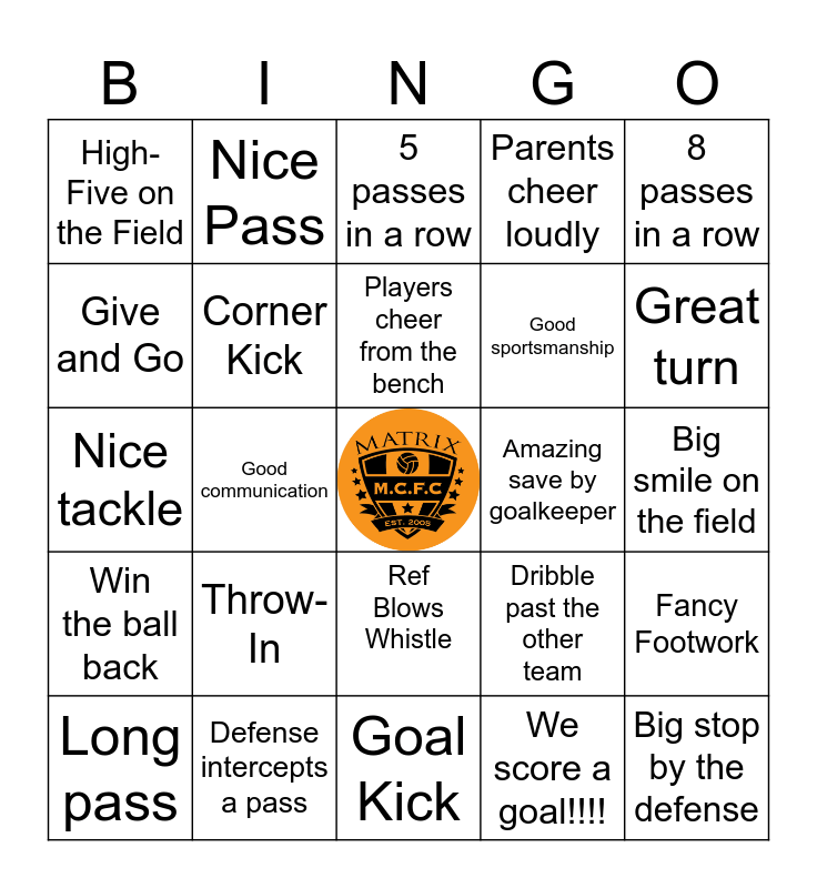 This bingo card has a free space and 24 words: Throw-In, Defense intercepts a pass, Players cheer from the bench, Long pass, 8 passes in a row, High-Five on the Field, Give and Go, Nice Pass, Amazing save by goalkeeper, Ref Blows Whistle, Good sportsmanship, Nice tackle, Dribble past the other team, Fancy Footwork, Corner Kick, We score a goal!!!!, Big smile on the field, 5 passes in a row, Great turn, Good communication, Big stop by the defense, Win the ball back, Parents cheer loudly and Goal Kick.