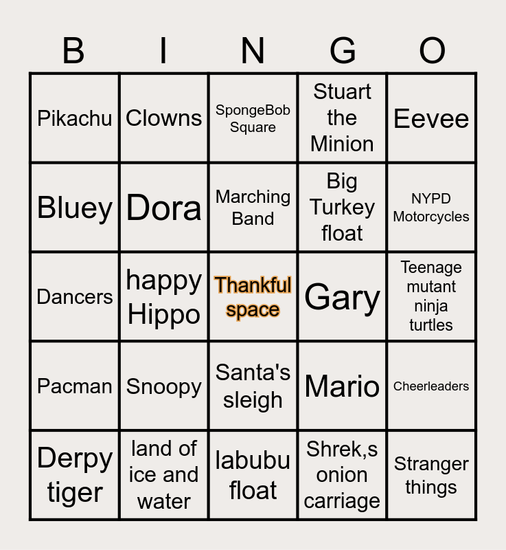 This bingo card has a free space and 24 words: Snoopy, land of ice and water, Marching Band, Derpy tiger, Eevee, Pikachu, Bluey, Clowns, Gary, Santa's sleigh, Big Turkey float, Dancers, Mario, Cheerleaders, Dora, Shrek,s onion carriage, Teenage mutant ninja turtles, SpongeBob Square, NYPD Motorcycles, happy Hippo, Stranger things, Pacman, Stuart the Minion and labubu float.