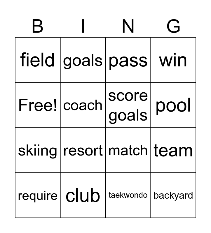This bingo card has 16 words: club, team, pass, field, skiing, goals, match, taekwondo, Free!, coach, require, win, resort, pool, score goals and backyard.