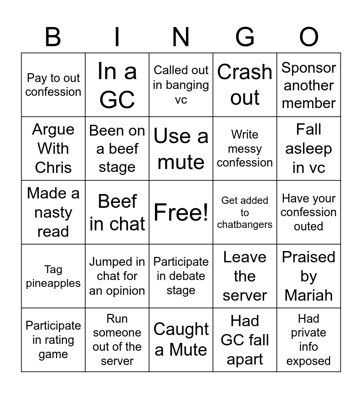 This bingo card has a free space and 46 words: Yelled at by mariah, Had private info exposed, Had to get sponsored, Caught a Mute, Jumped in chat for an opinion, Drunk in vc, In a GC, Crying in VC, Argue With Chris, Sending nudes, Been on a beef stage, Crash out, Praised by Mariah, Leave the server, Loves Messy Ham, Sext with another member, Use a mute, Get added to chatbangers, Post daily selfies, Sponsor another member, Beef in chat, Had GC fall apart, Pay to out confession, Write messy confession, Have an e relationship, Fall asleep in vc, Participate in rating game, Dodge a stage, Participate in debate stage, Tag pineapples, Act Fake gay, DM a catfish, Create an Alt account, Get an unsolicited nude, Get yelled at to use chat bangers, Run someone out of the server, Have your confession outed, Called a hoe by mariah, Scamming sponsor money, Faked a pregnancy, GC exposed, Called out in banging vc, Made a nasty read, Went to a meetup, Had a scandal outed and Efucked another member.
