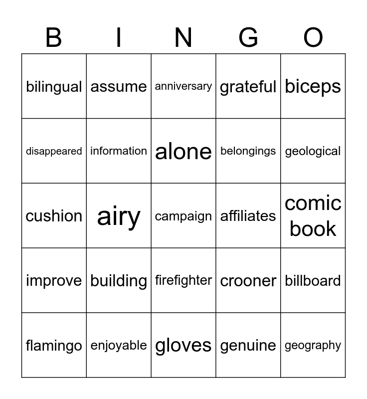 This bingo card has 100 words: aardvark, bathing suit, comic book, employee, furnaces, accurate, beach, competence, engineer, gallon, adorable, because, consequence, enjoyable, gasoline, aerobic, belongings, consume, erupting, gelatin, aerospace, beneficial, course, established, general, affiliates, biceps, crooner, eucalyptus, genius, airy, bilingual, cruelty, eventually, genuine, alone, billboard, curly, excavate, geography, ancient, biography, cushion, excavation, geological, anniversary, blindfolded, cyclist, exciting, gloves, announcer, bookstore, daffodil, expedition, government, antique, bottom, depart, expensive, grateful, applause, breakfast, desert, explanation, half, armchair, Buckingham Palace, develop, eyebrow, harmful, array, building, dirty, eyelashes, honored, arteries, businesses, disappeared, fence, hygiene, artichoke, campaign, documentary, firefighter, hymns, assume, capillaries, doorknob, fitness, improve, auditorium, cartography, dormouse, flamingo, information, avenue, cattle, downpour, forehead and inseparable.