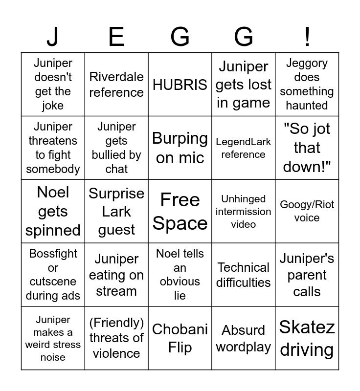 This bingo card has a free space and 38 words: Riot barks, Juniper gets bullied by Seth, Juniper gets bullied by Noel, Juniper gets bullied by chat, Juniper's parent calls, Juniper eating on stream, Burping on mic, In-game death interrupts joke, Jeggory does something haunted, LegendLark reference, Surprise Lark guest, Juniper gets lost in game, Skatez driving, Googy/Riot voice, Juniper threatens to fight somebody, Bossfight or cutscene during ads, Whisper cameo, HUBRIS, Hector cameo, Unhinged intermission video, Juniper doesn't get the joke, (Friendly) threats of violence, "So jot that down!", Juniper makes a weird stress noise, Stargate mention, Chobani Flip, Juniper forgets/ignores a game mechanic, Juniper talks words good, McChild pacifism, Ms. Noel school anecdote, "I'm going to push you!", Noel tells an obvious lie, Absurd wordplay, Riverdale reference, Stream gets completely derailed, Technical difficulties, Noel gets spinned and Skatez farting.