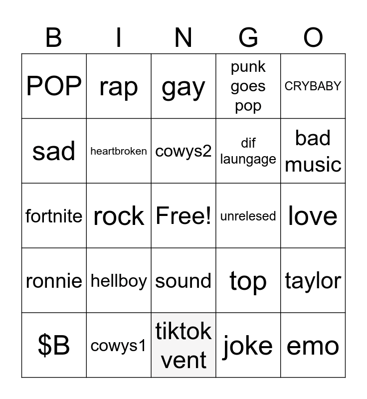 This bingo card has a free space and 24 words: hellboy, cowys1, cowys2, $B, CRYBABY, POP, sad, rap, unrelesed, sound, dif laungage, fortnite, top, taylor, heartbroken, joke, love, gay, bad music, rock, emo, ronnie, punk goes pop and tiktok vent.