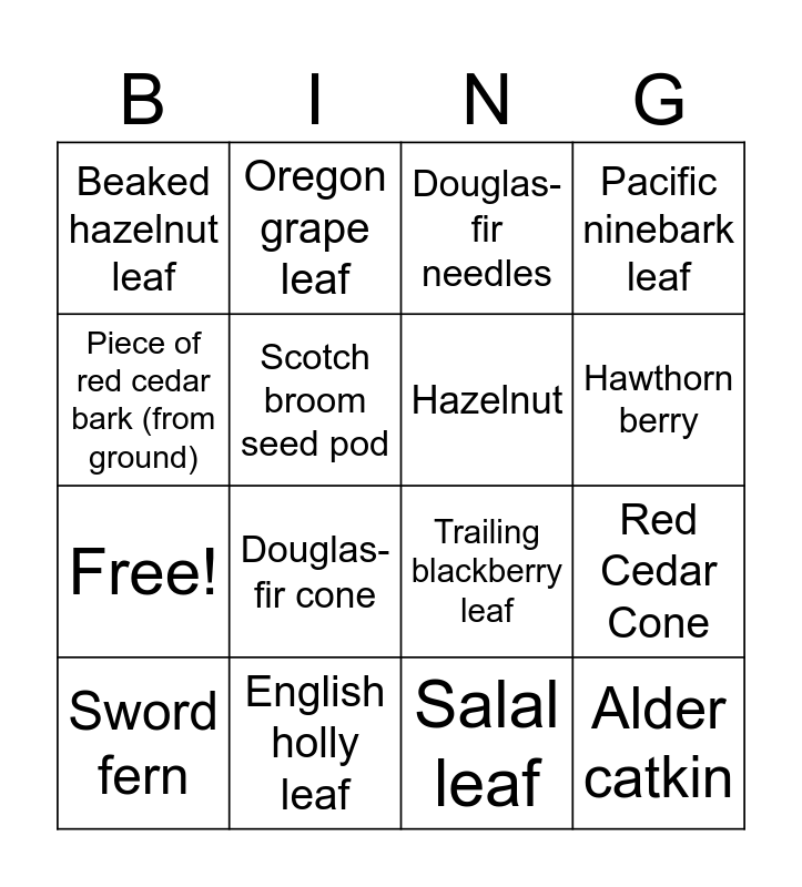 This bingo card has 20 words: Red Cedar Cone, Himalayan Blackberry leaf, Douglas-fir needles, Big leaf maple leaf, Sword fern, Piece of red cedar bark (from ground), English holly leaf, Beaked hazelnut leaf, Free!, Oregon grape leaf, Douglas-fir cone, Trailing blackberry leaf, Scotch broom seed pod, Alder catkin, Hazelnut, Reed Canary Grass blade, Hawthorn berry, Pacific ninebark leaf, Salal leaf and Stinging Nettle stalk.