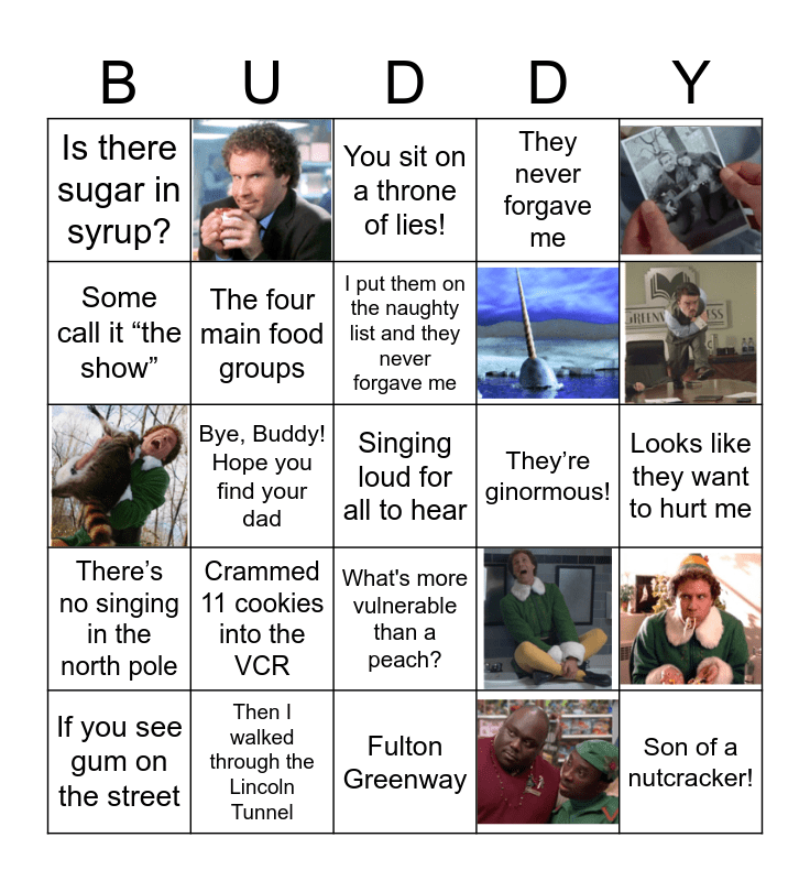 This bingo card has 15 images, a free space and 27 words: What’s your favorite color?, Bye, Buddy! Hope you find your dad, Susan Wells, Cotton-headed ninny muggins!, Son of a nutcracker!, Then I walked through the Lincoln Tunnel, They never forgave me, Looks like they want to hurt me, Some call it “the show”, Crammed 11 cookies into the VCR, If you see gum on the street, My affinity for elf culture, They’re ginormous!, Is there sugar in syrup?, The four main food groups, What's more vulnerable than a peach?, I’m a human, but I was raised by elves, He’s an angry elf, You sit on a throne of lies!, Very purpley, Not now, Arctic Puffin, There’s no singing in the north pole, You should be on a Christmas card, I put them on the naughty list and they never forgave me, Fulton Greenway, Santa, here?! I know him! and I’m in a store and I’m singing!.
