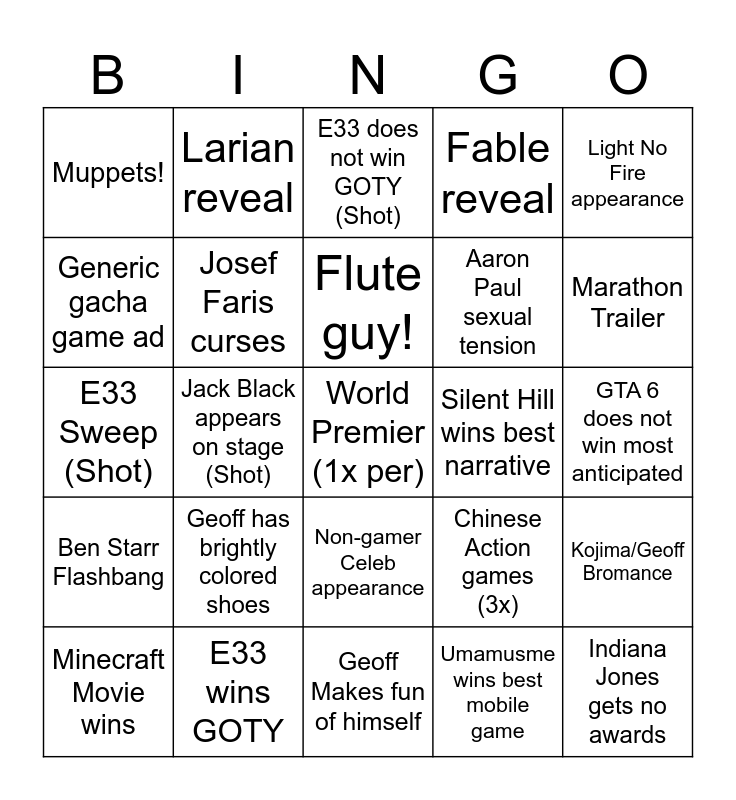 This bingo card has a free space and 24 words: Geoff has brightly colored shoes, E33 wins GOTY, Flute guy!, Minecraft Movie wins, Light No Fire appearance, Muppets!, Generic gacha game ad, Larian reveal, Silent Hill wins best narrative, Non-gamer Celeb appearance, Aaron Paul sexual tension, E33 Sweep (Shot), Chinese Action games (3x), Kojima/Geoff Bromance, Josef Faris curses, Umamusme wins best mobile game, GTA 6 does not win most anticipated, E33 does not win GOTY (Shot), Marathon Trailer, Jack Black appears on stage (Shot), Indiana Jones gets no awards, Ben Starr Flashbang, Fable reveal and Geoff Makes fun of himself.