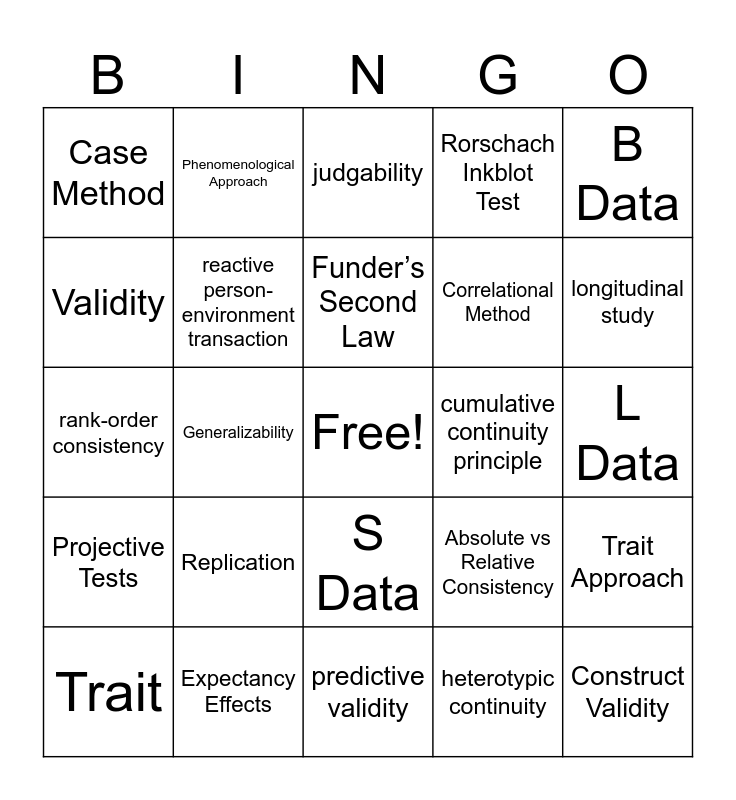 This bingo card has a free space and 66 words: Personality, Psychological Triad, Basic Approach, Trait Approach, Biological Approach, Psychoanalytic Approach, Phenomenological Approach, Funder’s First Law, Funder’s Second Law, Funder’s Third Law, S Data, I Data, L Data, B Data, Reliability, Validity, Generalizability, Case Method, Experimental Method, Correlational Method, Replication, Projective Tests, Rorschach Inkblot Test, Thematic Apperception Test (TAT), Objective Tests, Factor Analysis, Rational Test Construction, Empirical Test Construction, Construct Validity, Realistic Accuracy Model (RAM), Trait, Person–Situation Debate, Situationism, Interactionism, Absolute vs Relative Consistency, Expectancy Effects, Self-Fulfilling Prophecy, rank-order consistency, heterotypic continuity, active person-environment transaction, reactive person-environment transaction, evocative person-environment transaction, cumulative continuity principle, temperament, cross-sectional study, cohort effect, longitudinal study, social clock, maturity principle, narrative identity, many-trait approach, single-trait approach, essential-trait approach, typological approach, California Q-Set, lexical hypothesis, critical realism, constructivism, judgability, predictive validity, moderator variable, scatter plot, independent variable, dependent variable, projective hypothesis and learning approach.