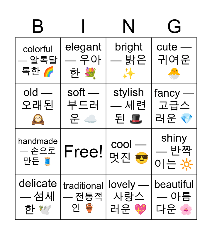 This bingo card has 18 words: Free!, beautiful — 아름다운 🌸, bright — 밝은 ✨, colorful — 알록달록한 🌈, cool — 멋진 😎, cute — 귀여운 🐣, delicate — 섬세한 🕊️, elegant — 우아한 💐, fancy — 고급스러운 💎, handmade — 손으로 만든 🧵, lovely — 사랑스러운 💖, old — 오래된 🕰️, shiny — 반짝이는 🔆, soft — 부드러운 ☁️, stylish — 세련된 🎩, tiny — 아주 작은 🐁, traditional — 전통적인 🏺 and unique — 독특한 🌀.