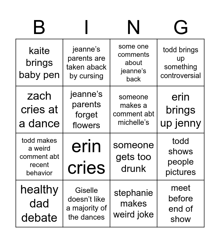 This bingo card has 16 words: Giselle doesn’t like a majority of the dances, todd shows people pictures, some one comments about jeanne’s back, kaite brings baby pen, todd makes a weird comment abt recent behavior, jeanne’s parents are taken aback by cursing, someone gets too drunk, stephanie makes weird joke, zach cries at a dance, jeanne’s parents forget flowers, healthy dad debate, todd brings up something controversial, erin cries, erin brings up jenny, someone makes a comment abt michelle’s and meet before end of show.