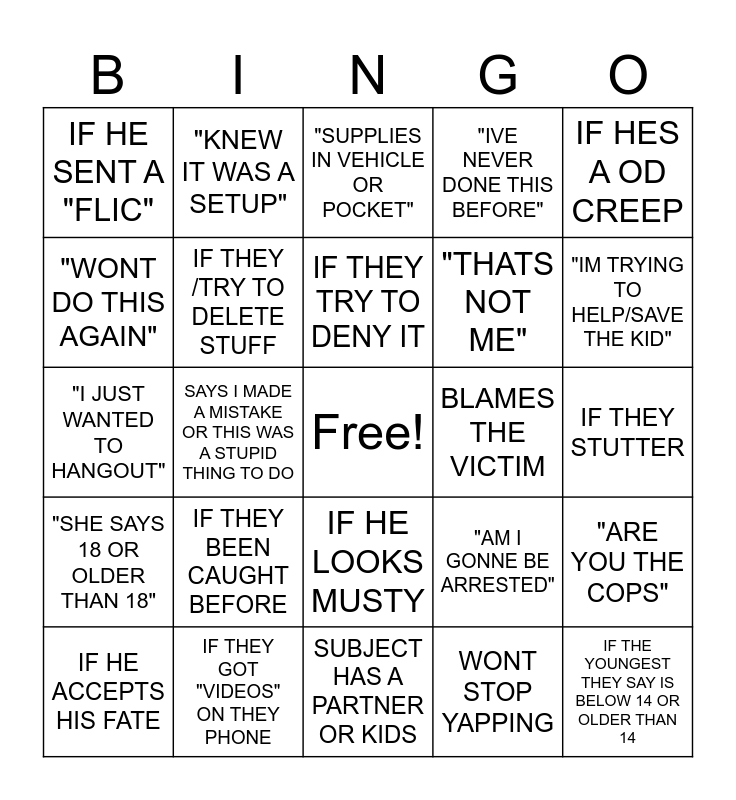 This bingo card has a free space and 24 words: IF THEY BEEN CAUGHT BEFORE, IF THEY GOT "VIDEOS" ON THEY PHONE, IF THEY TRY TO DENY IT, IF HE ACCEPTS HIS FATE, IF HES A OD CREEP, IF HE SENT A "FLIC", "WONT DO THIS AGAIN", "KNEW IT WAS A SETUP", BLAMES THE VICTIM, IF HE LOOKS MUSTY, "THATS NOT ME", "I JUST WANTED TO HANGOUT", "AM I GONNE BE ARRESTED", "ARE YOU THE COPS", IF THEY /TRY TO DELETE STUFF, WONT STOP YAPPING, IF THEY STUTTER, "SUPPLIES IN VEHICLE OR POCKET", "IM TRYING TO HELP/SAVE THE KID", SAYS I MADE A MISTAKE OR THIS WAS A STUPID THING TO DO, IF THE YOUNGEST THEY SAY IS BELOW 14 OR OLDER THAN 14, "SHE SAYS 18 OR OLDER THAN 18", "IVE NEVER DONE THIS BEFORE" and SUBJECT HAS A PARTNER OR KIDS.