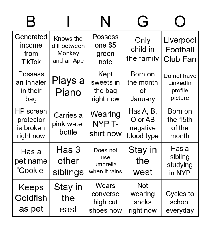 This bingo card has a free space and 24 words: Has 3 other siblings, Stay in the east, Kept sweets in the bag right now, Keeps Goldfish as pet, Liverpool Football Club Fan, Generated income from TikTok, Possess an Inhaler in their bag, Knows the diff between Monkey and an Ape, Has A, B, O or AB negative blood type, Does not use umbrella when it rains, Born on the month of January, HP screen protector is broken right now, Stay in the west, Has a sibling studying in NYP, Plays a Piano, Not wearing socks right now, Born on the 15th of the month, Possess one $5 green note, Do not have LinkedIn profile picture, Carries a pink water bottle, Cycles to school everyday, Has a pet name 'Cookie', Only child in the family and Wears converse high cut shoes now.