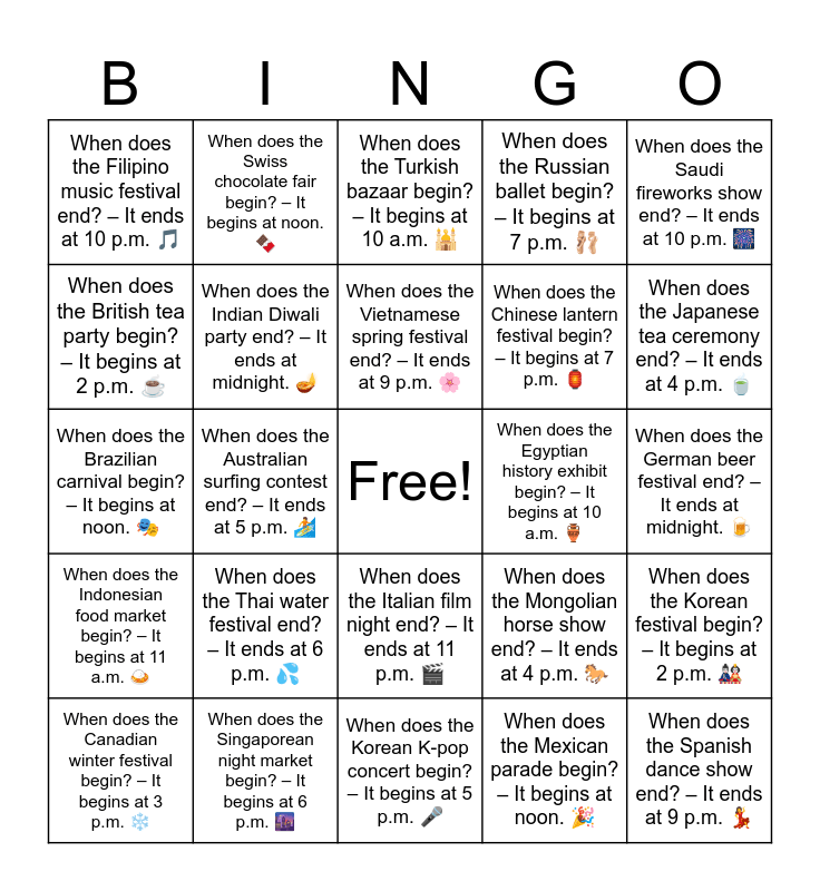 This bingo card has a free space and 28 words: When does the Korean festival begin? – It begins at 2 p.m. 🎎, When does the American concert begin? – It begins at 8 p.m. 🎶, When does the Chinese lantern festival begin? – It begins at 7 p.m. 🏮, When does the Mexican parade begin? – It begins at noon. 🎉, When does the British tea party begin? – It begins at 2 p.m. ☕, When does the Turkish bazaar begin? – It begins at 10 a.m. 🕌, When does the Swiss chocolate fair begin? – It begins at noon. 🍫, When does the Indonesian food market begin? – It begins at 11 a.m. 🍛, When does the Egyptian history exhibit begin? – It begins at 10 a.m. 🏺, When does the Canadian winter festival begin? – It begins at 3 p.m. ❄️, When does the Brazilian carnival begin? – It begins at noon. 🎭, When does the Russian ballet begin? – It begins at 7 p.m. 🩰, When does the Singaporean night market begin? – It begins at 6 p.m. 🌆, When does the Korean K-pop concert begin? – It begins at 5 p.m. 🎤, When does the Japanese tea ceremony end? – It ends at 4 p.m. 🍵, When does the French fashion show end? – It ends at 5 p.m. 👗, When does the Thai water festival end? – It ends at 6 p.m. 💦, When does the Indian Diwali party end? – It ends at midnight. 🪔, When does the Vietnamese spring festival end? – It ends at 9 p.m. 🌸, When does the Italian film night end? – It ends at 11 p.m. 🎬, When does the Filipino music festival end? – It ends at 10 p.m. 🎵, When does the Malaysian lantern walk end? – It ends at 8 p.m. 🏮, When does the Spanish dance show end? – It ends at 9 p.m. 💃, When does the Australian surfing contest end? – It ends at 5 p.m. 🏄, When does the German beer festival end? – It ends at midnight. 🍺, When does the Mongolian horse show end? – It ends at 4 p.m. 🐎, When does the Saudi fireworks show end? – It ends at 10 p.m. 🎆 and When does the Japanese flower viewing end? – It ends at 6 p.m. 🌸.