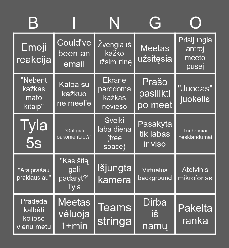 This bingo card has a free space and 43 words: Kalba užsimutinę, Pakelta ranka, Pertraukinėja, Pradeda kalbėti keliese vienu metu, Girdisi kolegos kabinete, Dirba iš namų, Žvengia iš kažko užsimutinę, "Atsiprašau turiu atsijungti", Prisijungia antroj meeto pusėj, Meetas vėluoja 1+min, Meetas užsitęsia, Pasakyta tik labas ir viso, Išjungta kamera, "Kas šitą gali padaryt?" Tyla, Kažką rodo, bet pamiršo pasharint screen, Teams stringa, Meetas pasibaigia neįpusėjęs, Tyla 5s, Nejuokingas juokelis, "Juodas" juokelis, Could've been an email, Ginčas, Dingsta iš meeto be jokių žinių, Emoji reakcija, Rašinėja į meeto chat'ą, Techniniai nesklandumai, Nesigirdi meet'o dėl kolegų kabinete, "Ar matot ekraną?", Virtualus background, "Atsiprašau praklausiau", Nukrypsta nuo temos, Ateivinis mikrofonas, Reikia laikino leidimo, "Gal gali pakomentuot?", Accepted, bet nedalyvauja, Tyliai kalba, Serga, bet dirba, Ekrane parodoma kažkas neviešo, "Nebent kažkas mato kitaip", Prašo pasilikti po meet, Rankos sudėtos maldelei, Kalba su kažkuo ne meet'e and Linksi galva.