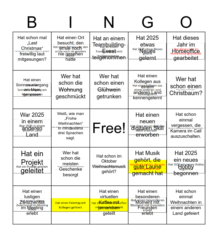 This bingo card has 28 images, a free space and 27 words: Hat 2025 ein neues Hobby begonnen, Hat eine neue Sprache oder ein neues Wort gelernt, Hat einen Kollegen aus einem anderen Land kennengelernt, Hat einen besonderen Moment mit Freunden erlebt, Hat einen Sonnenuntergang am Meer genossen, Hat an einem Teambuilding-Event teilgenommen, Hat einen Ort besucht, den er/sie noch nie gesehen hatte, Hat ein Projekt geleitet, Hat einen neuen digitalen Skill erworben, Hat einen lustigen Zwischenfall im Meeting erlebt, War 2025 in einem anderen Land, Hat 2025 etwas Neues gelernt, Hat einen virtuellen Kaffee mit jemandem geteilt, Wer hat schon einen Christbaum?, Wer hat schon Plätzchen gebacken, Wer hat schon die meisten Geschenke besorgt, Wer hat schon die Wohnung geschmückt, Wer hat schon einen Glühwein getrunken, Hat schon im Oktober Weihnachtsmusik gehört?, Hat schon mal „Last Christmas“ freiwillig laut mitgesungen?, Hat den Weihnachtsbaum erst am 23. Dezember gekauft?, Hat schon einmal Weihnachten in einem anderen Land gefeiert, Weiß, wie man „Frohe Weihnachten“ in mindestens drei Sprachen sagt., Hat schon einmal vergessen, die Kamera im Call auszuschalten., Hat Musik gehört, die gute Laune gemacht hat, Hat dieses Jahr im Homeoffice gearbeitet and Hat ein Haustier fotografiert.