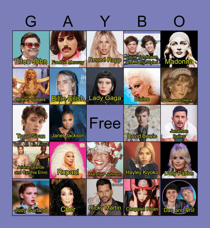 This bingo card has 24 images, a free space and 24 words: Rupaul, Cher, Lady Gaga, Judy Garland, Madonna, Elton John, Britney Spears, Freddie Mercury, David Bowie, Marsha P Johnson, Divine, Troye Sivan, Hayley Kiyoko, Dolly Parton, Billie Eilish, Chappell Roan, Jonathan Bailey, Reneé Rapp, Princess Diana, Janet Jackson, Dan and Phil, Ariana Grande and Cynthia Erivo, Louis Tomlinson and Harry Styles and Ricky Martin.