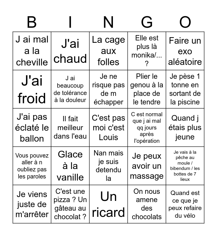 This bingo card has 25 words: Glace à la vanille, Un ricard, Je ne risque pas de m échapper, Je viens juste de m'arrêter, Faire un exo aléatoire, J ai mal a la cheville, J'ai froid, J'ai chaud, C est normal que j ai mal qq jours après I'opération, Nan mais je suis detendu la, Plier le genou à la place de le tendre, J'ai pas éclaté le ballon, Je peux avoir un massage, Je vais à la pêche au moule / bibendum / les bottes de 7 lieux, J ai beaucoup de tolérance à la douleur, Quand est ce que je peux refaire du vélo, Quand j étais plus jeune, La cage aux folles, Je pèse 1 tonne en sortant de la piscine, Il fait meilleur dans l'eau, C'est pas moi c'est Louis, C'est une pizza ? Un gâteau au chocolat ?, Vous pouvez aller à n oubliez pas les paroles, Elle est plus là monika/... ? and On nous amene des chocolats.
