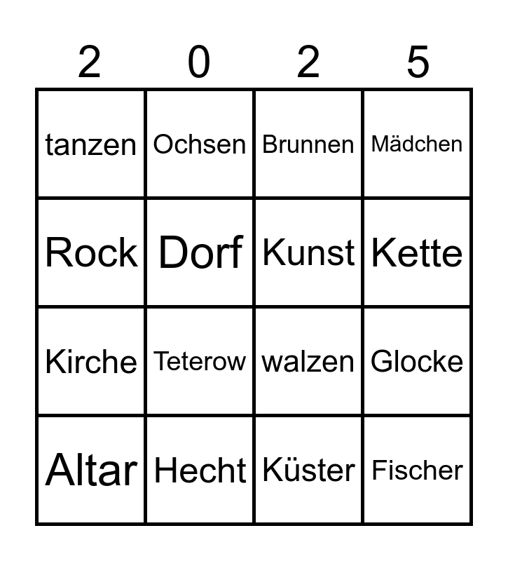 This bingo card has 16 words: Hecht, Glocke, Brunnen, tanzen, Kirche, Ochsen, walzen, Küster, Rock, Dorf, Altar, Mädchen, Teterow, Kette, Kunst and Fischer.