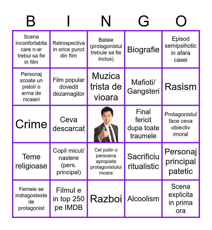 This bingo card has a free space and 44 words: Abuz de droguri, Scena explicita in prima ora, Mai mult de 3 scene explicite, Femeie se indragosteste de protagonist, Porneste de jos, ajunge sus, Alcoolism, Bataie (protagonistul trebuie sa fie inclus), Cel putin o prostituata, Episod semipsihotic in afara casei, Filmul e in top 250 pe IMDB, Biografie, Final fericit dupa toate traumele, Cel putin o persoana apropiata protagonistului moare, Copil micut/ nastere (pers. principal), Avort, Razboi, Mai lung de doua ore jumate, Crime, Misoginie, Rasism, Retrospectiva in orice punct din film, Somaj (puncte bonus daca voluntar), Cel putin un discurs motivational, Scena inconfortabila care n-ar trebui sa fie in film, Montaj, Protagonistul face ceva obiectiv imoral, Muzica trista de pian, Sinucidere, Sacrificiu ritualistic, Teme religioase, Distrugere publica, Personaj principal patetic, Orfani, Suma exorbitanta de bani de nicaieri, Ceva descarcat, Porneste de sus, ajunge jos, Final ok/ depresiv, Final ciclic, Muzica trista de vioara, Personaj scoate un pistol/ o arma de nicaieri, Mafioti/ Gangsteri, Tragic, Film popular dovedit dezamagitor and Actor foarte cunoscut.