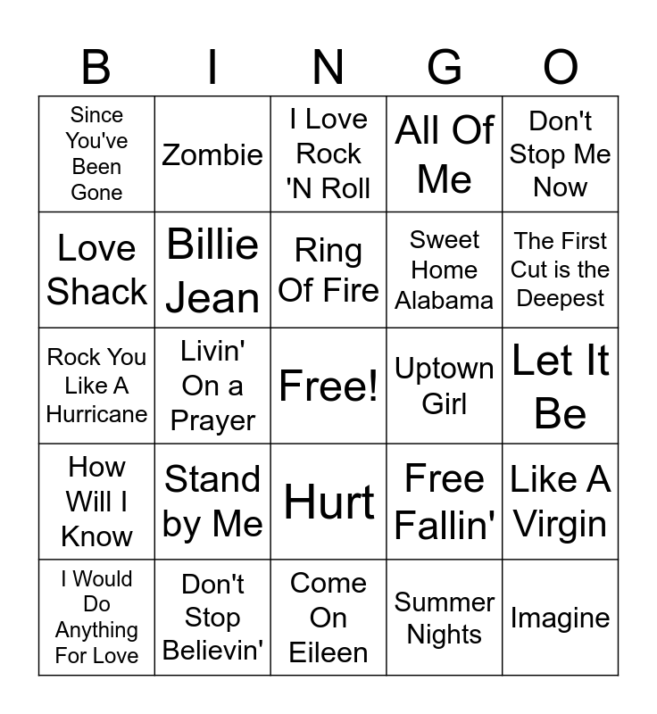 This bingo card has a free space and 60 words: Dancing Queen, Don't Stop Believin', Bohemian Rhapsody, How Will I Know, Summer Nights, I Will Survive, Billie Jean, Wonderwall, Sweet Home Alabama, Friends In Low Places, All Of Me, Sweet Caroline, Love Shack, I Want You Back, Africa, Since You've Been Gone, Imagine, Don't Stop Me Now, Cowboy Take Me Away, Ring Of Fire, Uptown Girl, I Love Rock 'N Roll, I Would Do Anything For Love, Like A Virgin, Don't Go Breaking My Heart, Like A Prayer, Born In The Usa, Santeria, The First Cut is the Deepest, Shallow, Can't Help Falling In Love, My Way, Take Me Home, Country Road, Total Eclipse of the Heart, Zombie, Walking On Sunshine, It's All Coming Back to Me Now, Livin' On a Prayer, Piano Man, Rock You Like A Hurricane, Hotel California, Stand by Me, Let It Be, The Sound Of Silence, Free Fallin', Respect, Love Me Tender, Let It Go, Ive Had the Time of My Life, Hurt, Come On Eileen, Aint No Mountain High Enough, Still Loving You, Summer Nights, I Want It That Way, My Heart Will Go On, I Will Always Love You, Yesterday, Girls Just Wanna Have Fun and Tiny Dancer.