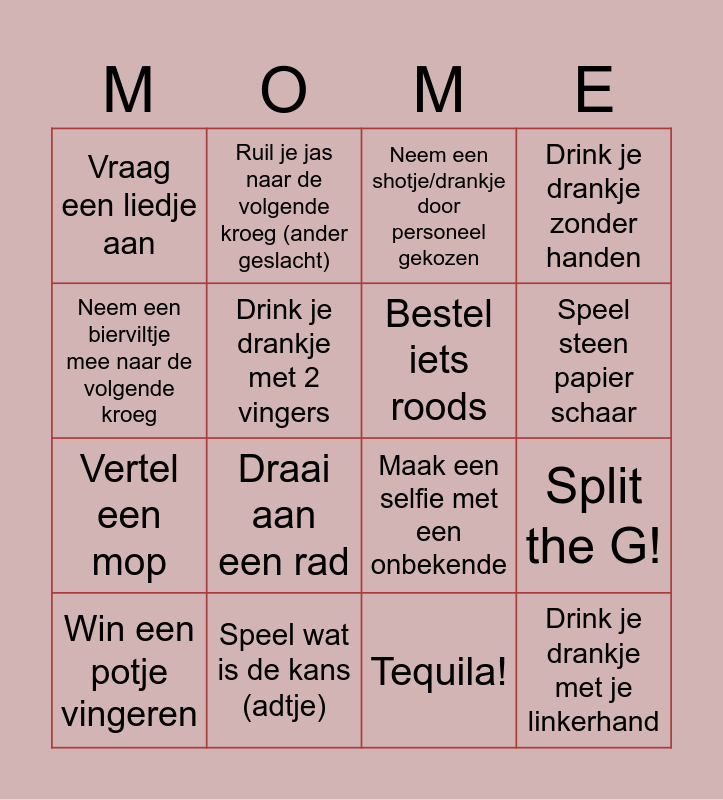 This bingo card has 16 words: Win een potje vingeren, Speel wat is de kans (adtje), Neem een shotje/drankje door personeel gekozen, Drink je drankje zonder handen, Neem een bierviltje mee naar de volgende kroeg, Ruil je jas naar de volgende kroeg (ander geslacht), Maak een selfie met een onbekende, Split the G!, Vraag een liedje aan, Drink je drankje met 2 vingers, Tequila!, Speel steen papier schaar, Vertel een mop, Draai aan een rad, Bestel iets roods and Drink je drankje met je linkerhand.