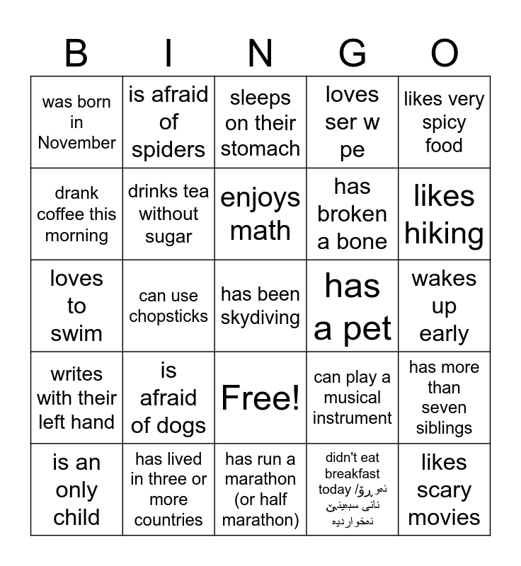 This bingo card has 26 words: Free!, didn't eat breakfast today /ئەوڕۆ نانی سبەینێ نەخواردیە, enjoys math, has lived in three or more countries, likes very spicy food, was born in November, drank coffee this morning, is afraid of spiders, wakes up early, can play a musical instrument, has broken a bone, loves to swim, has more than seven siblings, is an only child, can use chopsticks, can whistle, loves ser w pe, writes with their left hand, sleeps on their stomach, has been skydiving, likes hiking, has run a marathon (or half marathon), has a pet, is afraid of dogs, drinks tea without sugar and likes scary movies.