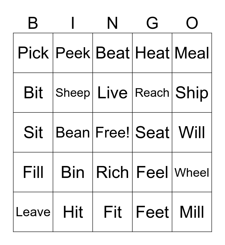 This bingo card has a free space and 24 words: Bin, Hit, Live, Leave, Meal, Pick, Bit, Peek, Seat, Rich, Reach, Sit, Feel, Wheel, Sheep, Feet, Will, Beat, Ship, Bean, Mill, Fill, Heat and Fit.