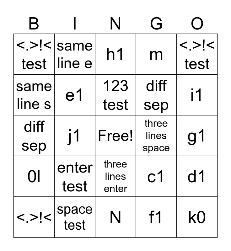 This bingo card has a free space and 24 words: enter test, space test, 123 test, <.>!<, <.>!< test, <.>!< test, same line s, same line e, three lines space, three lines enter, diff sep, diff sep, c1, d1, e1, f1, g1, h1, i1, j1, k0, 0l, m and N.