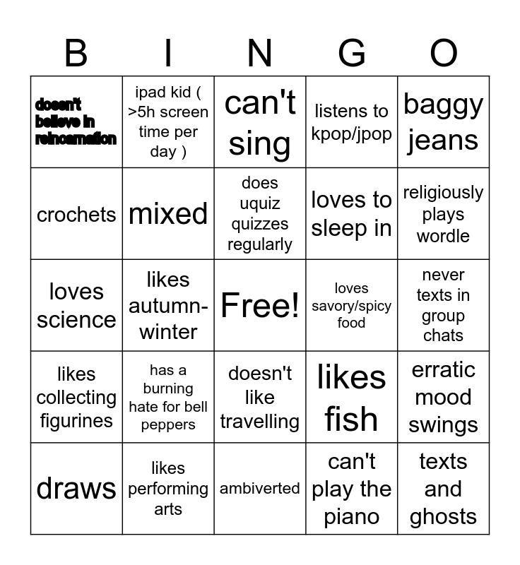 This bingo card has a free space and 24 words: has a burning hate for bell peppers, likes performing arts, does uquiz quizzes regularly, draws, baggy jeans, doesn't believe in reincarnation, crochets, ipad kid ( >5h screen time per day ), loves savory/spicy food, doesn't like travelling, loves to sleep in, loves science, likes fish, erratic mood swings, mixed, can't play the piano, never texts in group chats, can't sing, religiously plays wordle, likes autumn-winter, texts and ghosts, likes collecting figurines, listens to kpop/jpop and ambiverted.