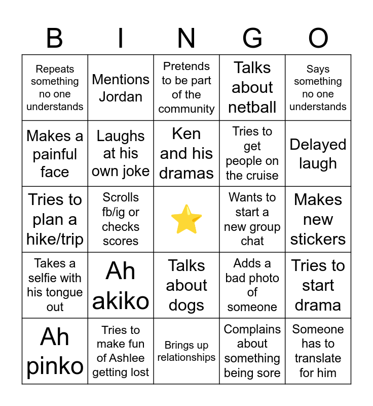 This bingo card has a free space and 24 words: Ah pinko, Ah akiko, Ken and his dramas, Complains about something being sore, Says something no one understands, Repeats something no one understands, Mentions Jordan, Pretends to be part of the community, Wants to start a new group chat, Makes new stickers, Tries to plan a hike/trip, Laughs at his own joke, Adds a bad photo of someone, Tries to start drama, Makes a painful face, Tries to make fun of Ashlee getting lost, Brings up relationships, Talks about netball, Delayed laugh, Takes a selfie with his tongue out, Scrolls fb/ig or checks scores, Talks about dogs, Tries to get people on the cruise and Someone has to translate for him.