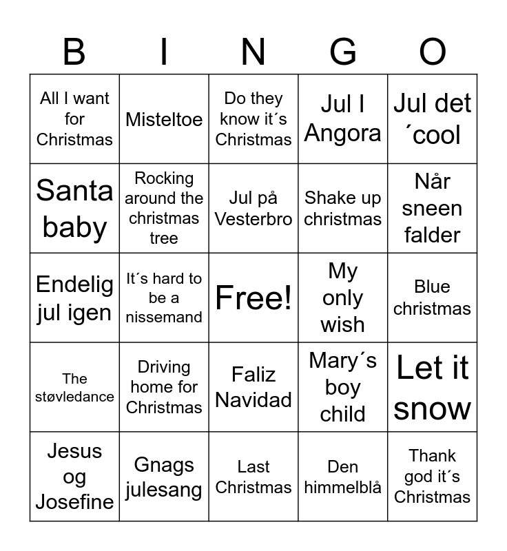 This bingo card has a free space and 25 words: Driving home for Christmas, Last Christmas, Jul på Vesterbro, Jesus og Josefine, Jul det´cool, All I want for Christmas, Santa baby, Misteltoe, My only wish, Faliz Navidad, Shake up christmas, Endelig jul igen, Mary´s boy child, Let it snow, Rocking around the christmas tree, Happy Xmas, Blue christmas, Do they know it´s Christmas, Når sneen falder, It´s hard to be a nissemand, Thank god it´s Christmas, Gnags julesang, The støvledance, Jul I Angora and Den himmelblå.